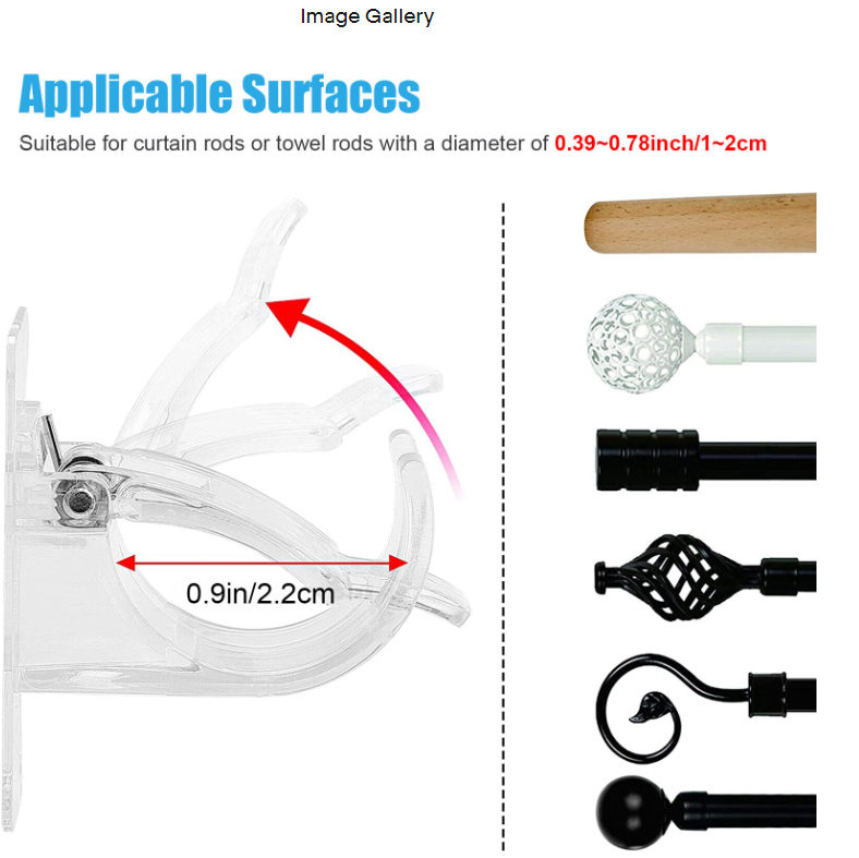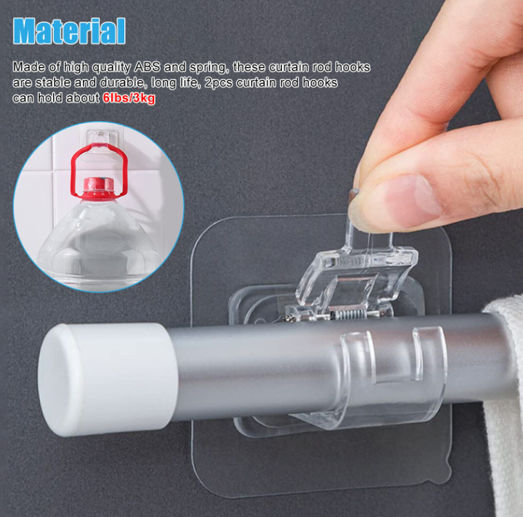 ? Material: Made of high-quality ABS and spring, these curtain rod hooks are stable and durable, long life, 2pcs curtain rod hooks can hold about 3kg/6lbs, if your curtain rod and curtains are more than 6lbs, please add them before hanging Some products as support.