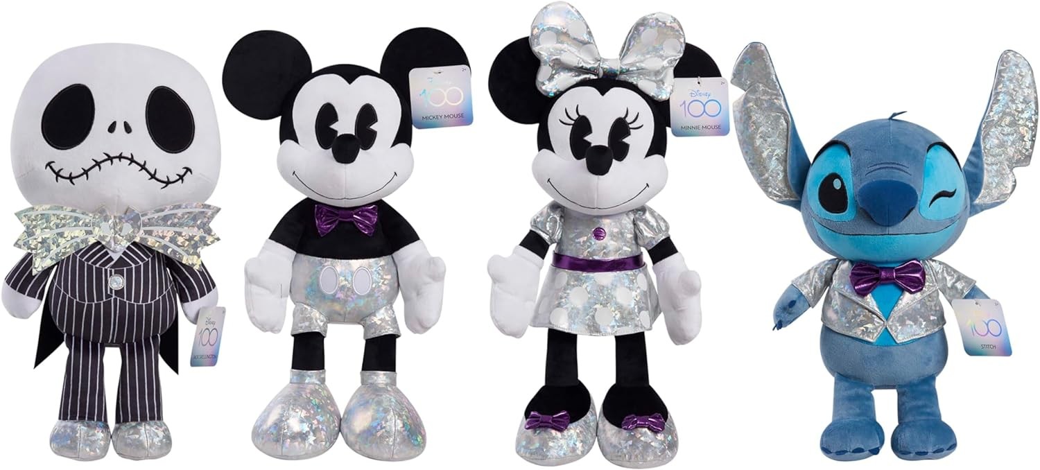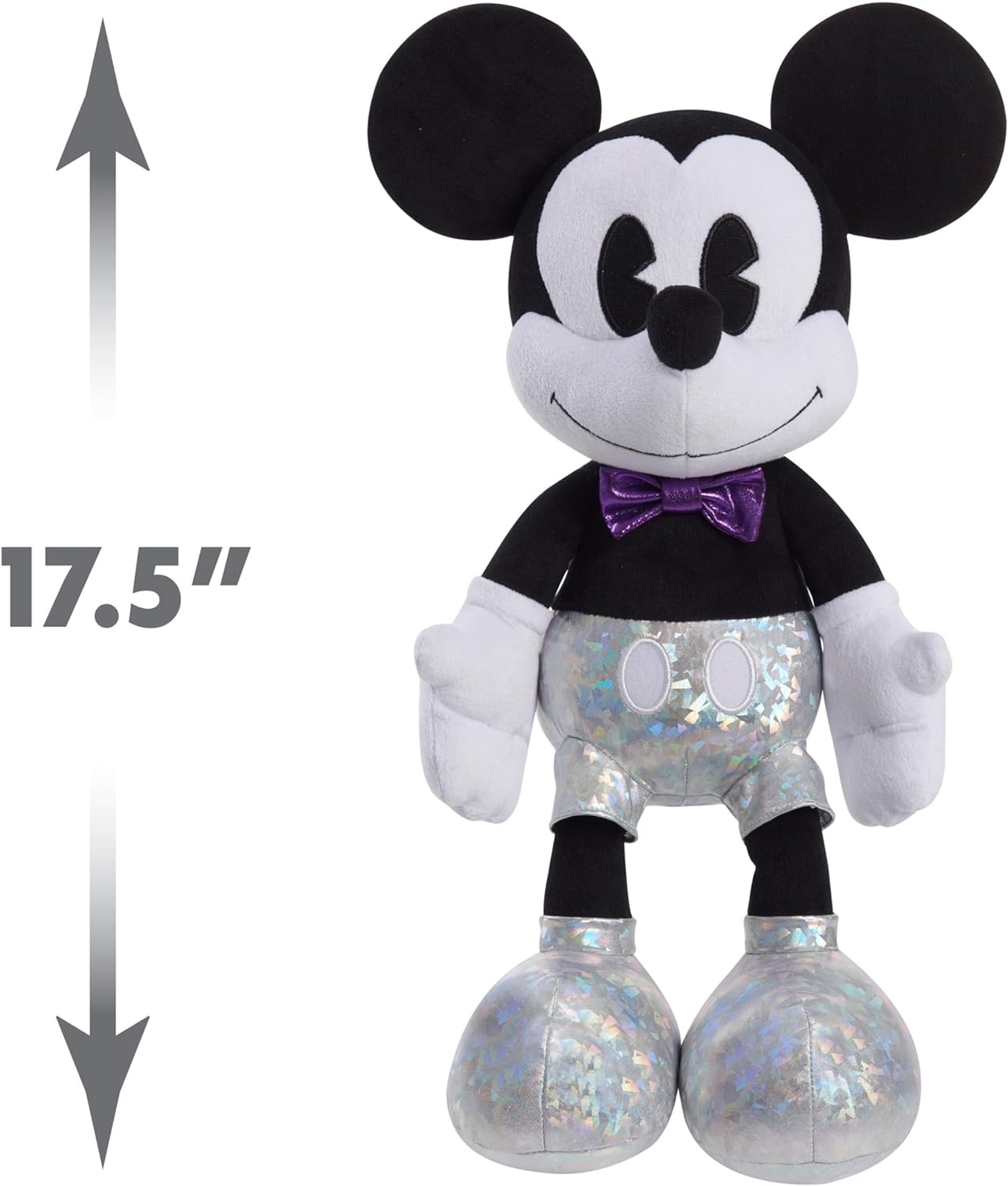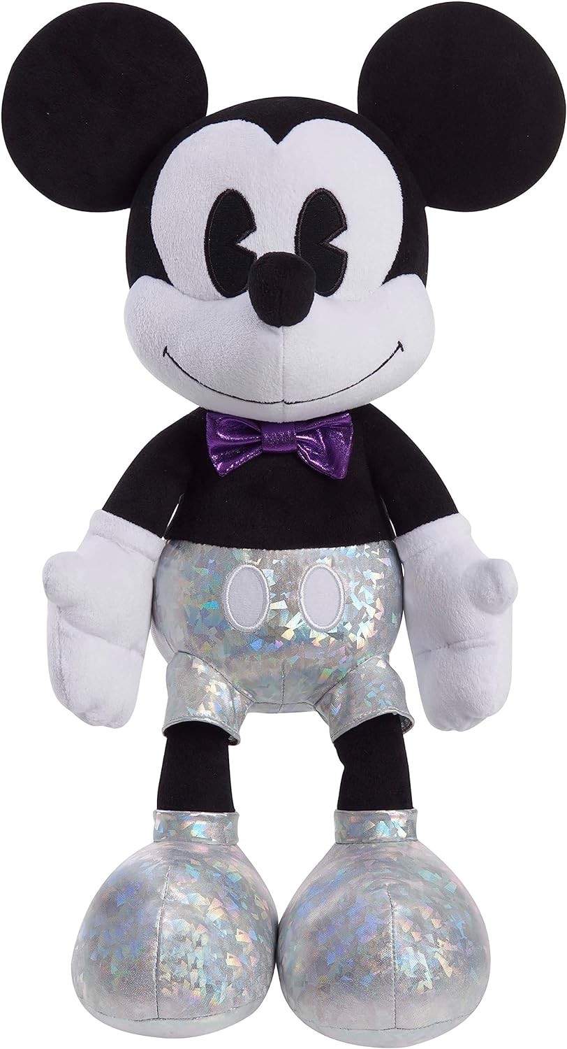 Celebrate a lifetime of memories with the Disney100 Years of Wonder Mickey Mouse Large Plush. This collection honors a century of magical storytelling by the Walt Disney Company. Mickey Mouse first appeared on the silver screen in 1928. He comes well prepared for the celebration in his stylish, platinum best from the top of his ears his special Disney100 Years of Wonder foot badge. This 19-inch tall, cuddly plush comes dressed in his shimmery purple bowtie, holographic shorts, signature white gloves, and features classic embroidered detailing. Mickey Mouse, along with the Minnie Mouse, Stitch, and Jack Skellington Disney100 Years of Wonder Large Plush, make a fantastic addition to any movie fan’s stuffed animal collection (each sold separately). These once-in-a-lifetime keepsakes make timely holiday, birthday, and “just because” gifts for fans and kids ages 2 years and up.