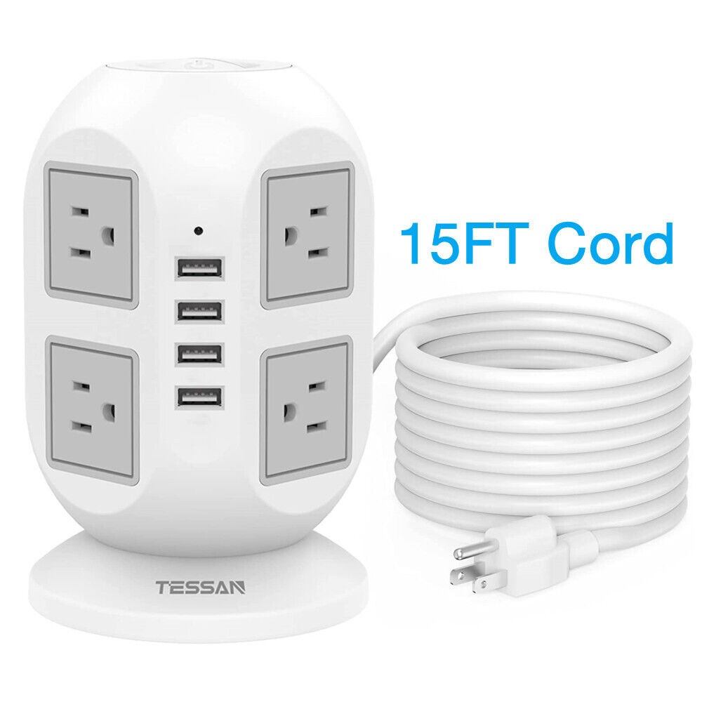 Power Strip Tower Surge Protector with 8 Outlet 4 USB 6/10/15 FT Extension Cord
