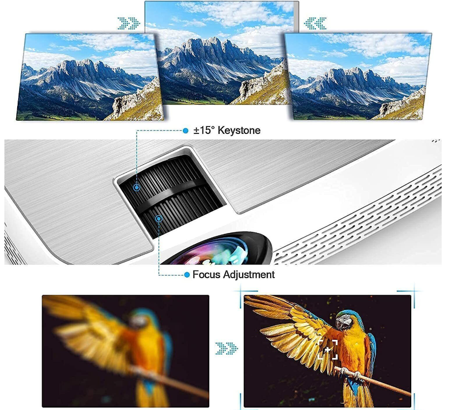 Bloomidea movie Projector adopts five layers well-grinding LCD lens to provide the customers with the clearer resolution. By adjusting the Focus button and the ±15° Keystone button, you can install the projector anywhere and catch the best video display image.The dual-fan system design based on the advanced noise reduction technology has solved the annoying overheating and noisy airflow problems. The projector with a cooling system can still bring you a comfortable experience even under long runtime.