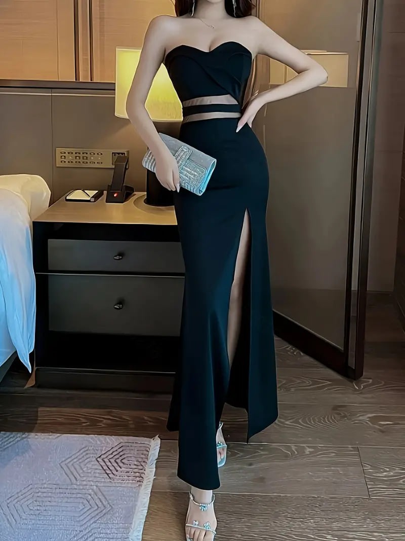 Solid Cut Out Split Thigh Tube Dress, Elegant Sleeveless Strapless Bodycon Dress, Women's Clothing