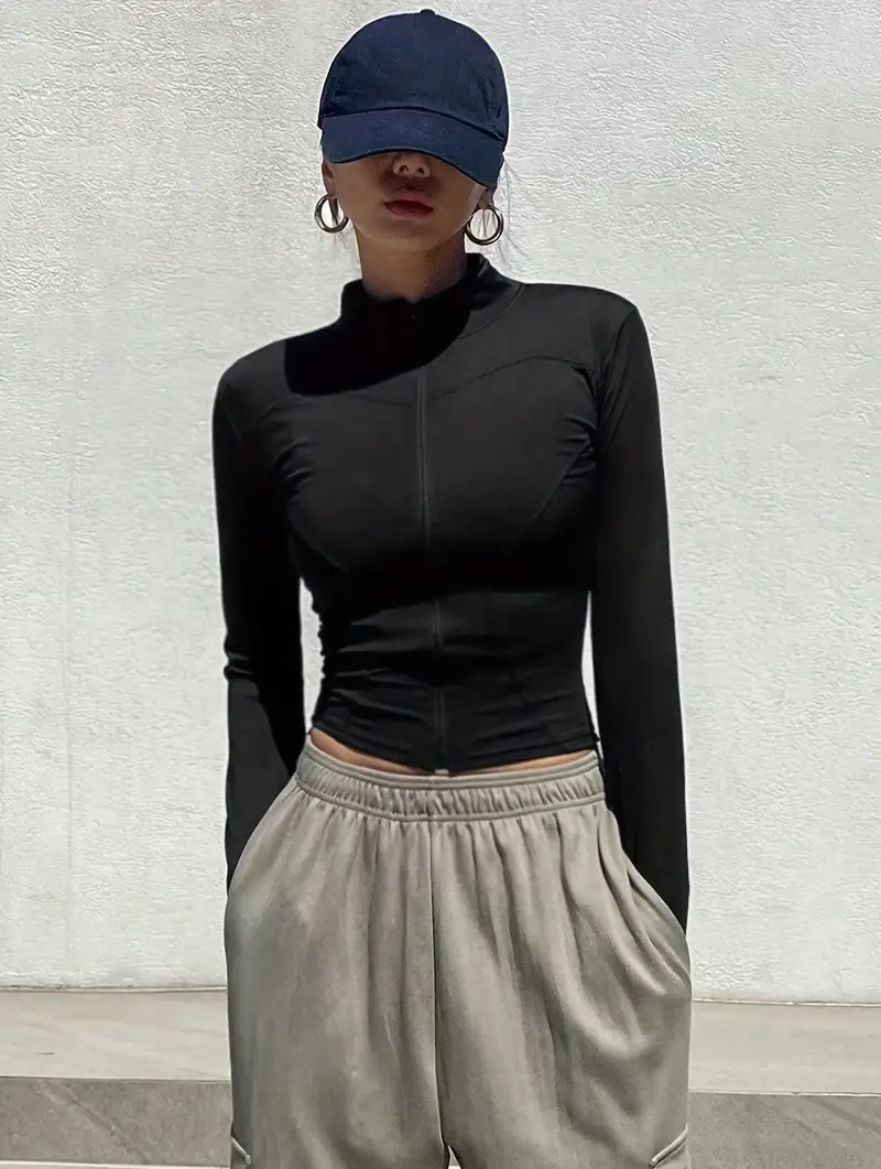 Solid Zipper Front Slim Top, Versatile Long Sleeve Mock Neck Top For Spring & Fall, Women's Clothing