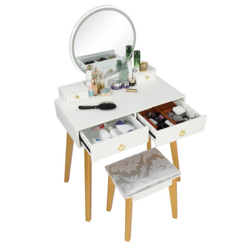 This is a very fashion, modern and simple dressing table. Adopting sturdy MDF and cylindrical solid wood leg support, the dressing table is full of modern sense. Large glass round mirror on the tabletop can show your beauty. Two small drawers and storage cases on the desktop can store your jewelry and cosmetics. Two drawers on the table with a panel can make a good classification for your cosmetics. When you are not using it, you can also remove it as a desk or other table. This dressing table can be placed in the living room, bedroom, or anywhere you want, which can provide the most beautiful furniture decoration for your home.